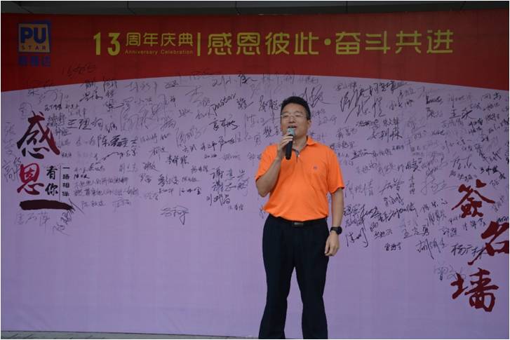 隨著運動員進(jìn)行曲的響起,全員迅速在行政樓前集合,隊伍整齊精神地排列。緊接著,普賽達(dá)總經(jīng)理任紹志先生發(fā)言,回顧了公司從0到13的跨越,構(gòu)建未來藍(lán)圖,借此,拉開了13周年慶的序幕。
