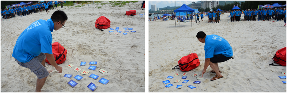而《信息傳遞》環(huán)節(jié),則考驗了團(tuán)隊溝通和個人執(zhí)行。教練規(guī)則講解過后,各支隊伍圍成圓圈,唇槍舌劍,斗智斗勇探討策略。哨聲一響,隊員們飛奔而出,沖向?qū)γ娣坪?,即刻轉(zhuǎn)身,以最快的速度往回跑,完成和下一隊員交接,并在團(tuán)隊中傳達(dá)翻牌信息。第一輪試水,沒有隊伍完成1-13的順序翻牌。第2輪開始,賽況越來越激烈,節(jié)奏也越來越快,最終5隊率先完成任務(wù),斬獲冠軍。