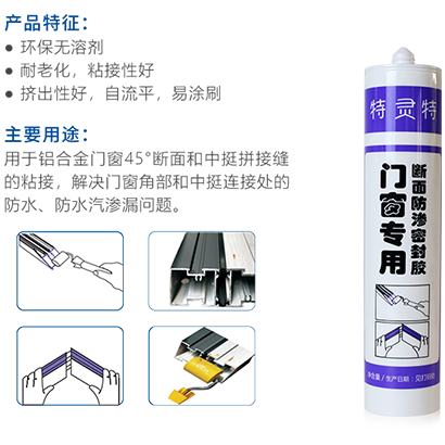 用于鋁合金門窗45°斷面和中挺拼接縫的粘接,解決門窗角部和中挺連接處的防水、防水汽滲漏問題。
